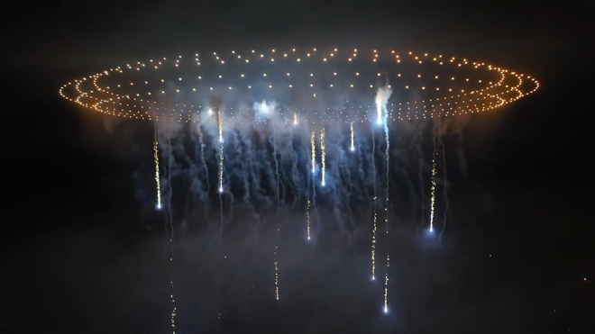 In the dark night sky, nearly a thousand drones carrying brilliant fireworks shot straight into the sky in an orderly manner. In an instant, the fireworks slowly fell like shooting stars, and a magnificent "gate to the sky" opened. Video