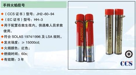 (CCS certificate) model: JH2-60-94 (EC certificate) model: HH-3 Used in a life raft for victims to call for help Comply with SOLAS, 1974/1996 and LSA rules Main technical parameters: 1) luminous color: red; 2) luminous intensity: ≥15000cd; 3) burning time: 60s; 4) validity: 3 years.