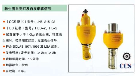 (CCS certificate) model: JH8-215-92 (EC certificate) model: HLS-2, HL-2 The life buoy is not less than 4.0KG, when the life buoy is released, the smoke is started and a lifesaving signal is sent out Comply with SOLAS, 1974/1996 and LSA rules Main technical parameters: 1) luminous color: orange; 2) burning time: ≥15min 3) luminous intensity: ≥2cd; 4) Duration of lighting:≥2h ; 5) validity: 3 years.