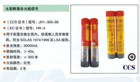 (CCS certificate) model: JH1-300-86 (EC certificate) model: HR-3 Used in a life raft for victims to call for help Comply with SOLAS, 1974/1996 and LSA rules Main technical parameters: 1) launch height:≥300m 2) luminous color: red; 3) luminous intensity: ≥30000cd; 4) burning time: ≥40s; 5) validity: 3 years.