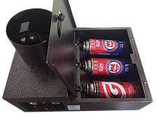 3 butane gas canisters are installed inside the system(one is for pilot flame and the other two are for main flame). The main flame fuel canisters are warmed with heaters so that it can make the flame height approx. 2 meter