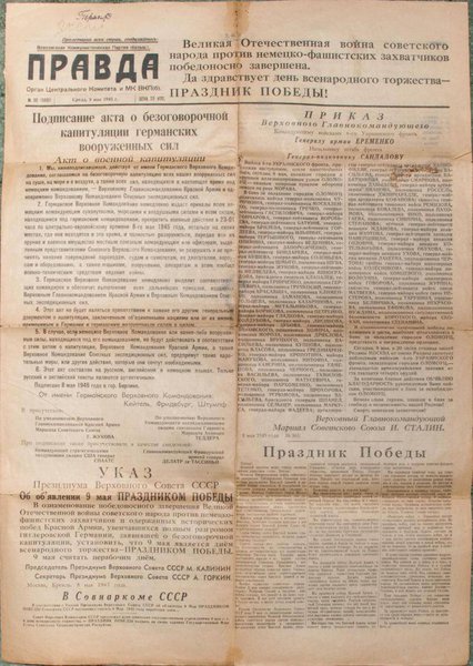 В ночь на 9 мая 1945 года не спал никто. Жители замерли перед своми радио-приемниками в нетерпеливом ожидании заявленного ранее важного сообщения. В 2.10 Герой Советского Союза, диктор Юрий Левитан прочитал акт о военной капитуляции фашистской Германии и Указ Президиума Верховного совета СССР об объявлении 9 мая днем всенародного торжества - Днем Победы.