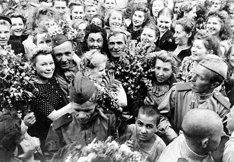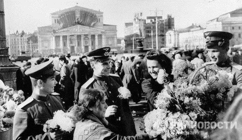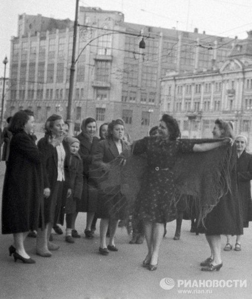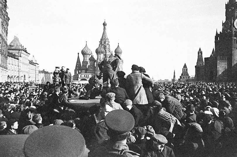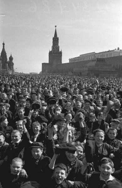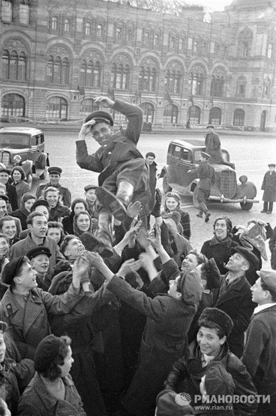 Людей на улицах становилось все больше и больше, кто-то шел с гармонью, кто-то с детьми на плечах, появились знамена, со всех улиц Москвы колонны двигались на Красную площадь. Военных хватали на руки, раскачивали, целовали и подолгу выкрикивали их имена. Несколько раз более десяти тысяч голосов спели хором самую знаменитую песню военных лет "Катюша"