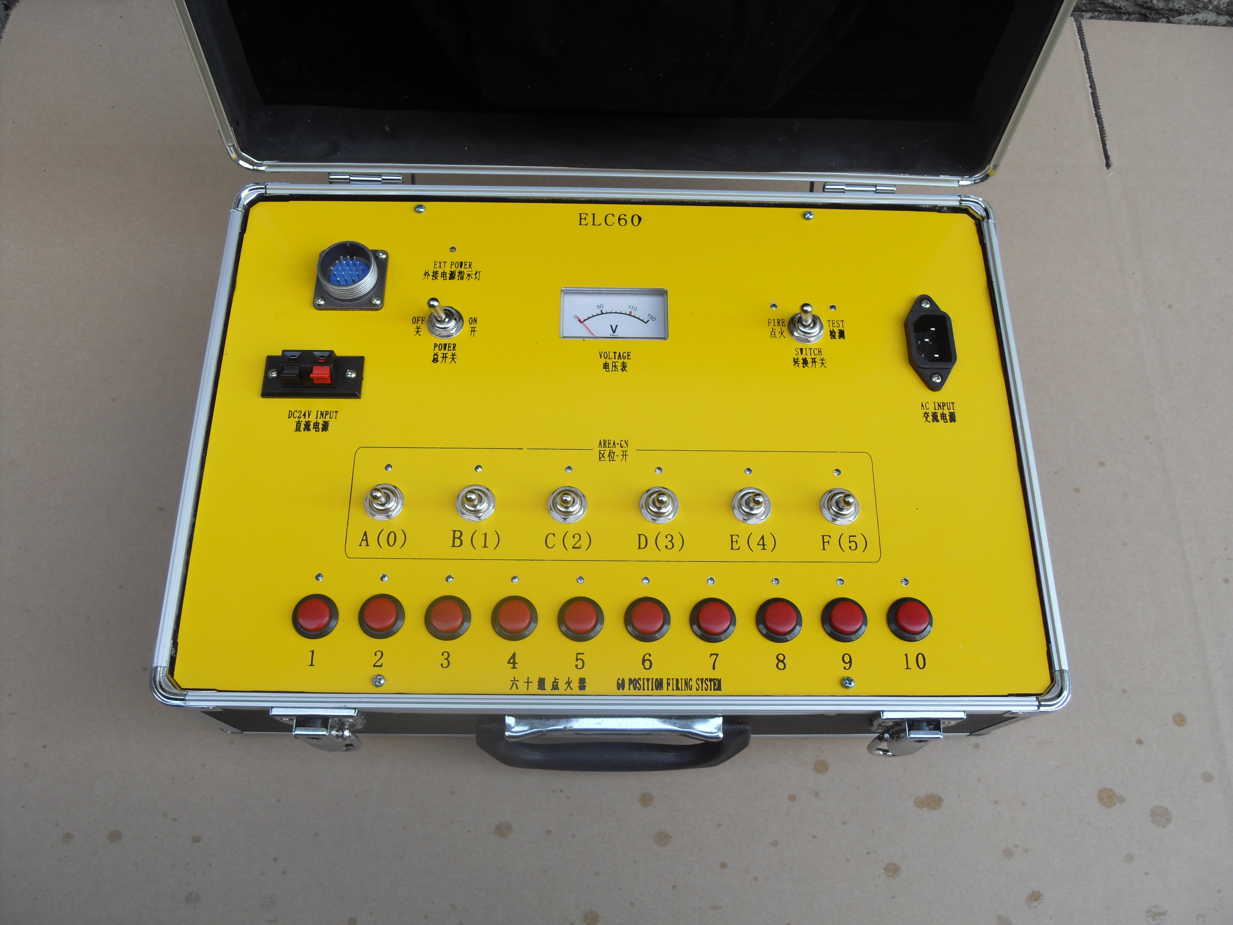 ELC60 is a high power fireworks igniter, divided into a, B, C, D, e, F 6 zone, consists of three lines, each line row group of 20 (2 District), a total of 60 sets, each set of combustible put about 10 fireworks ignition head, cable main configurations rows of 80 meters, side line row 10 m * 2 root