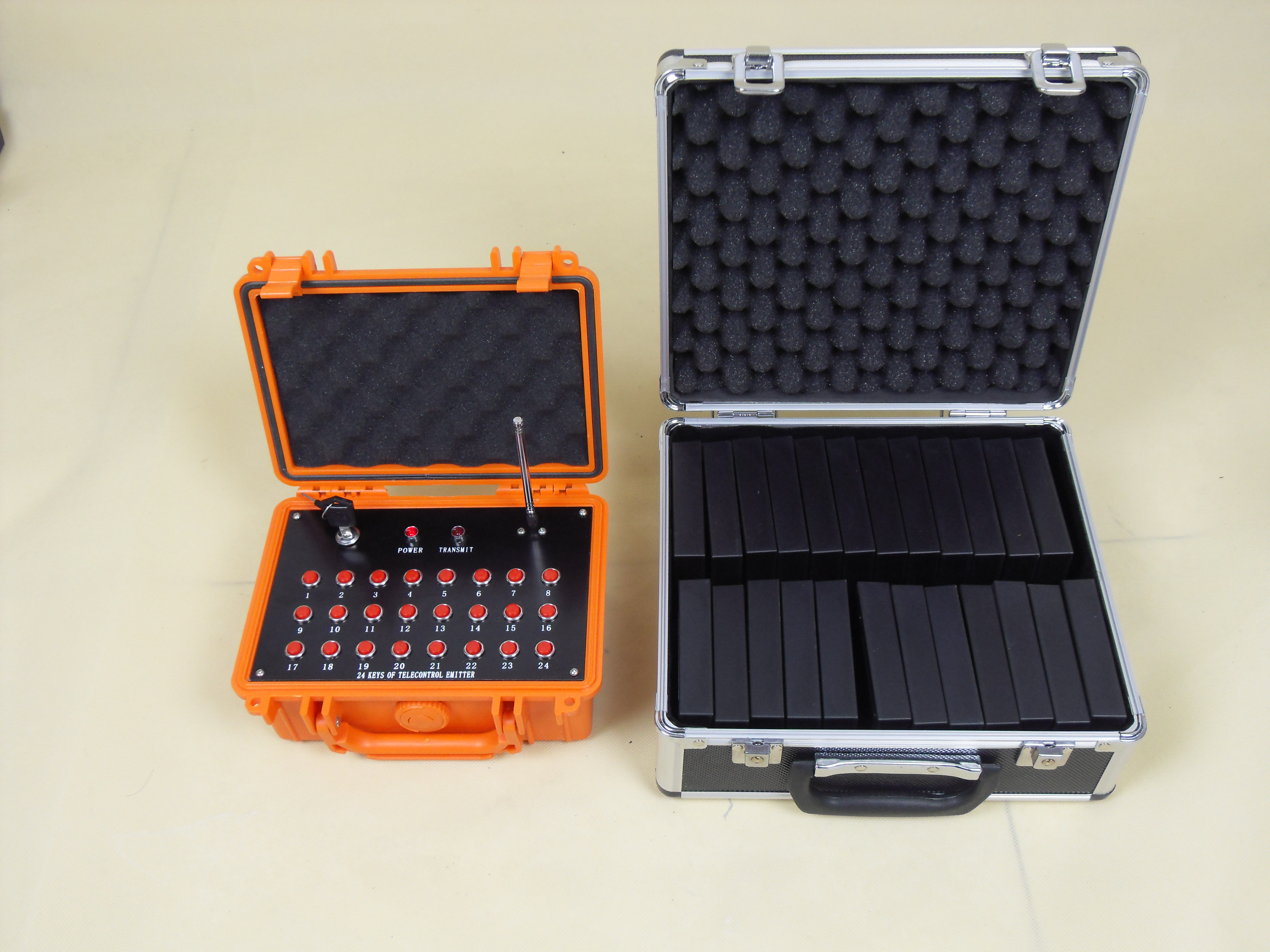 The products use 4 pieces dry battery to supply power, receiver boxes put beside the fireworks products,each receiver box can ignite 2-5 pieces ignite at the same time in series. Can fire both electrical ematch and power ematch.the distance of the remote is about 80 meters