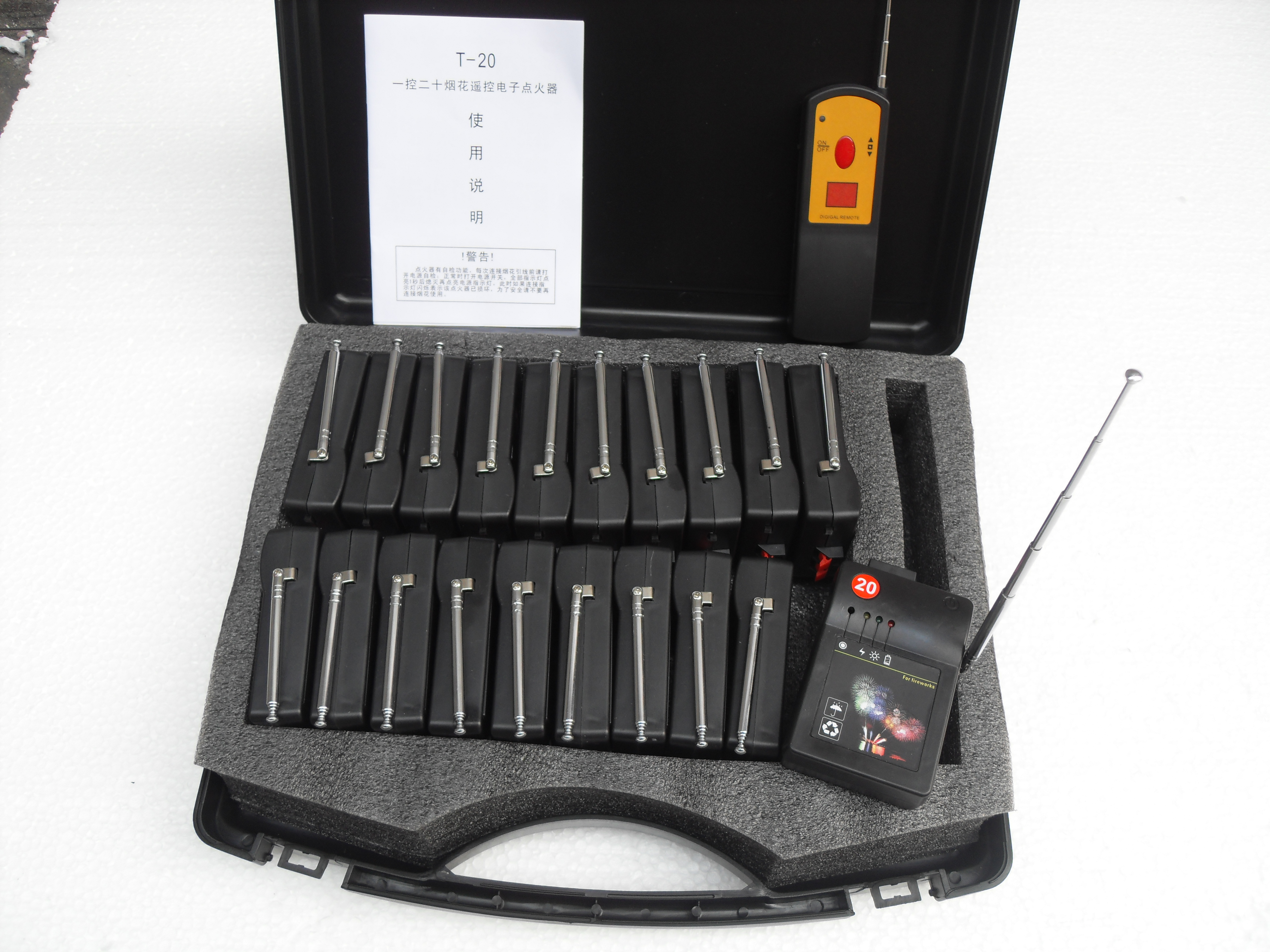 T-20 is a practical small size,a remote controlled electronic ignition of many fireworks products,using 1 million of non-repetition of the more secure codec technology,which allows the set off of fireworks can be tens of meters to a few hundred meters from the set off of wireless remote control,no ignition officers atclose range,have the function of a key with 20 groups at the same time set off and a key with 20 groups scan be set up the time in chronological order to set off,makes the fireworks'set off of the most convenient,the best results.